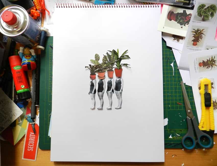 The collage is hand made. Images were used from a vintage “house plants” guide and more vintage books.