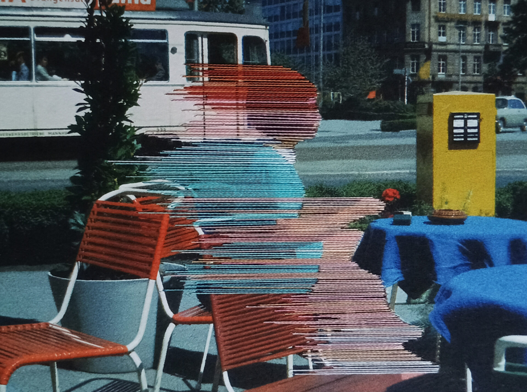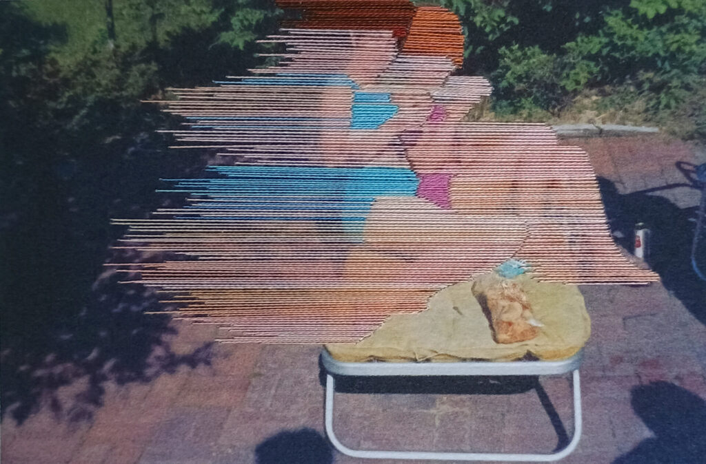 On top of the main image subject, horizontal straight lines have been stitched, like they’re being blown by the wind, like a faded memory. This obscures the main object while perpetuating it at the same time.